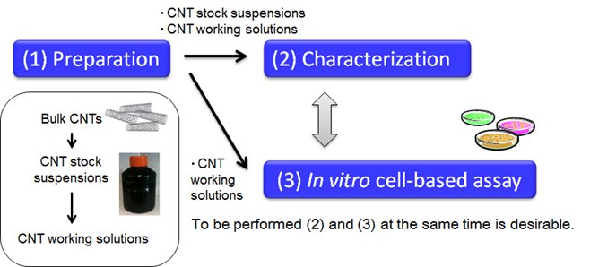 ![]() Outline of sample preparation and measurement, and the in vitro cell-based assay, which are used in the safety testing of CNTs |