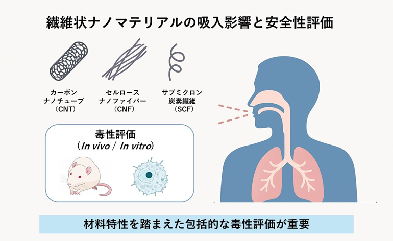 本論文では、近年、産業利用が急速に拡大している繊維状ナノマテリアルを対象に、吸入曝露時の健康影響、特に肺毒性と免疫応答に焦点を当て、その評価の考え方と最新の研究知見を解説しています。対象材料としては、カーボンナノチューブ(CNT)やセルロースナノファイバー(CNF)などが取り上げられています。