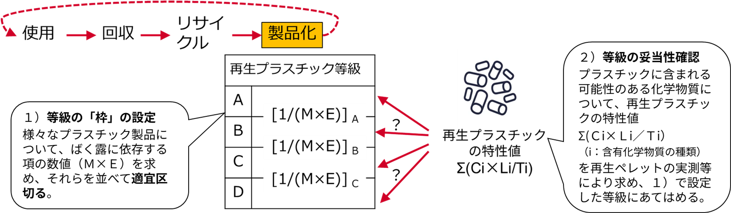 等級の指標は、ある再生プラスチックをある用途で使った場合の化学物質リスクの大きさとし、リスク評価におけるハザード比に相当する量、「C×L×M×E/T」で表すものとします(C:再生プラスチックペレット中濃度、L:溶出特性、M:暴露媒体特性、E:暴露係数、T:暴露上限値)。その上で、プラスチック製品の使われ方(ばく露)に依存するパラメータ(M×E)により等級の「枠」を設定し(図の1)、ここに実測等で求めた再生ペレット中の化学物質情報「特性値」(C×L/T)をあてはめて等級の妥当性を確認します(図の2)。