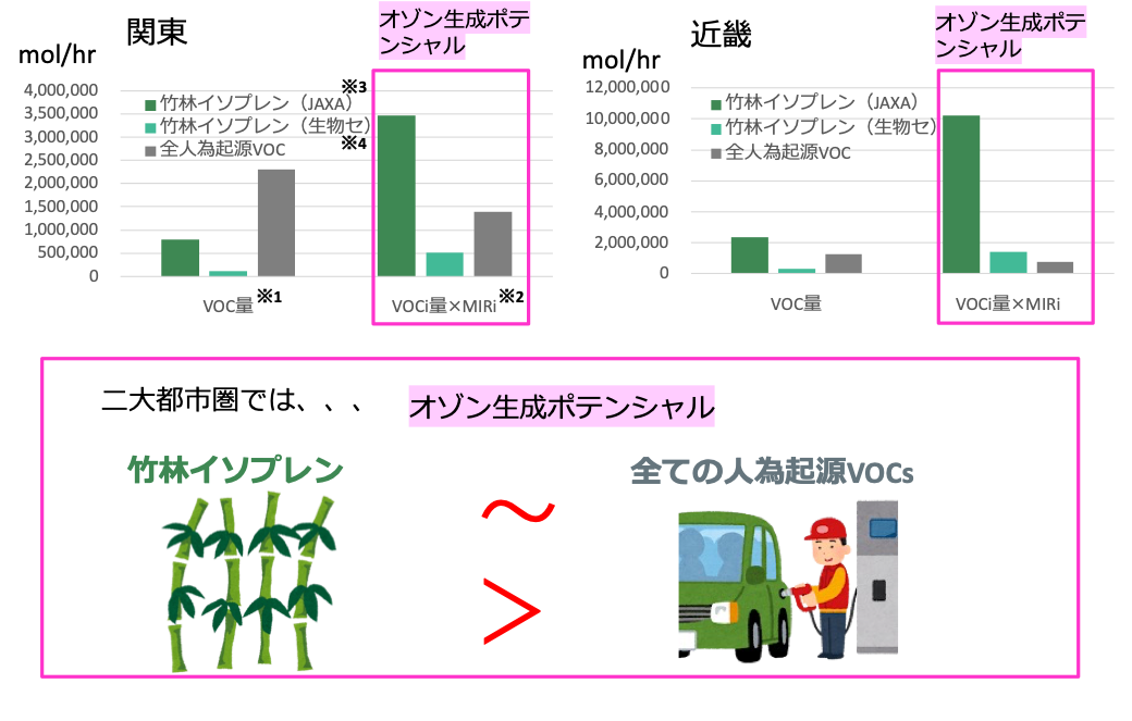 ※1 VOC量:竹林からのイソプレン基礎放出量(8月;気温 30 ℃,光量 1000 PPFD)と全人為起源からのVOC排出量(ADMER-pro内蔵;8月,午後2時)