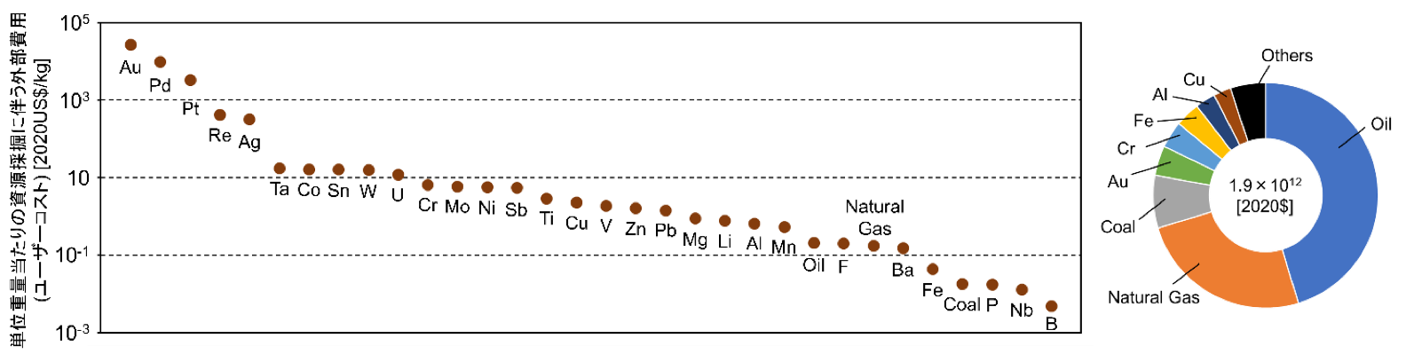 図 単位重量当たりの資源採掘に伴う外部費用 (左) および世界における年間資源採掘に伴う外部費用 (右)